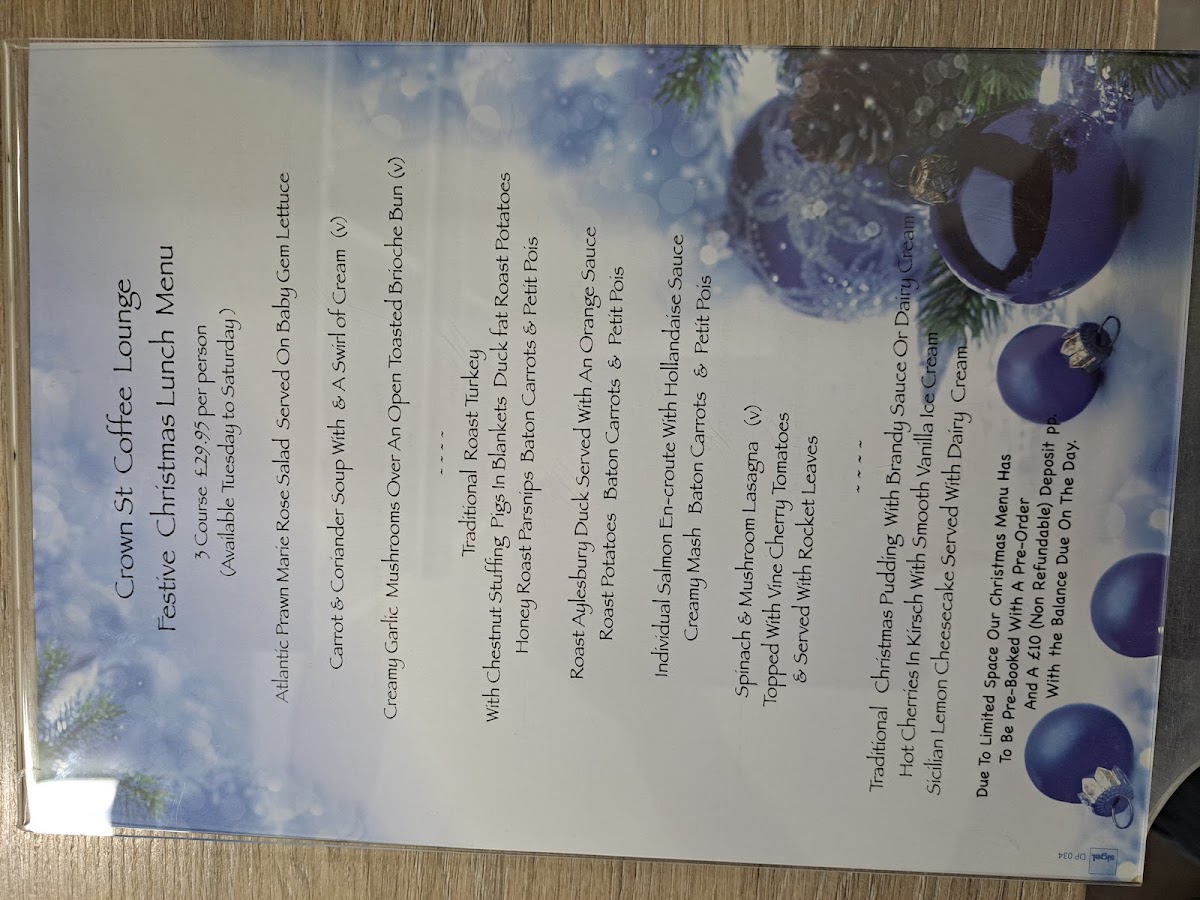 The menu at Crown Street Coffee Lounge offers a variety of coffee beverages, including specialty options such as the Vanilla Latte. Alongside the drinks, the menu features a selection of cakes and baked goods like the Victoria Sandwich, suitable for coffee breaks and casual snacking. Breakfast items are also available, providing options for morning meals, while light lunches can be enjoyed with offerings such as sourdough toasties accompanied by salad and crisps.